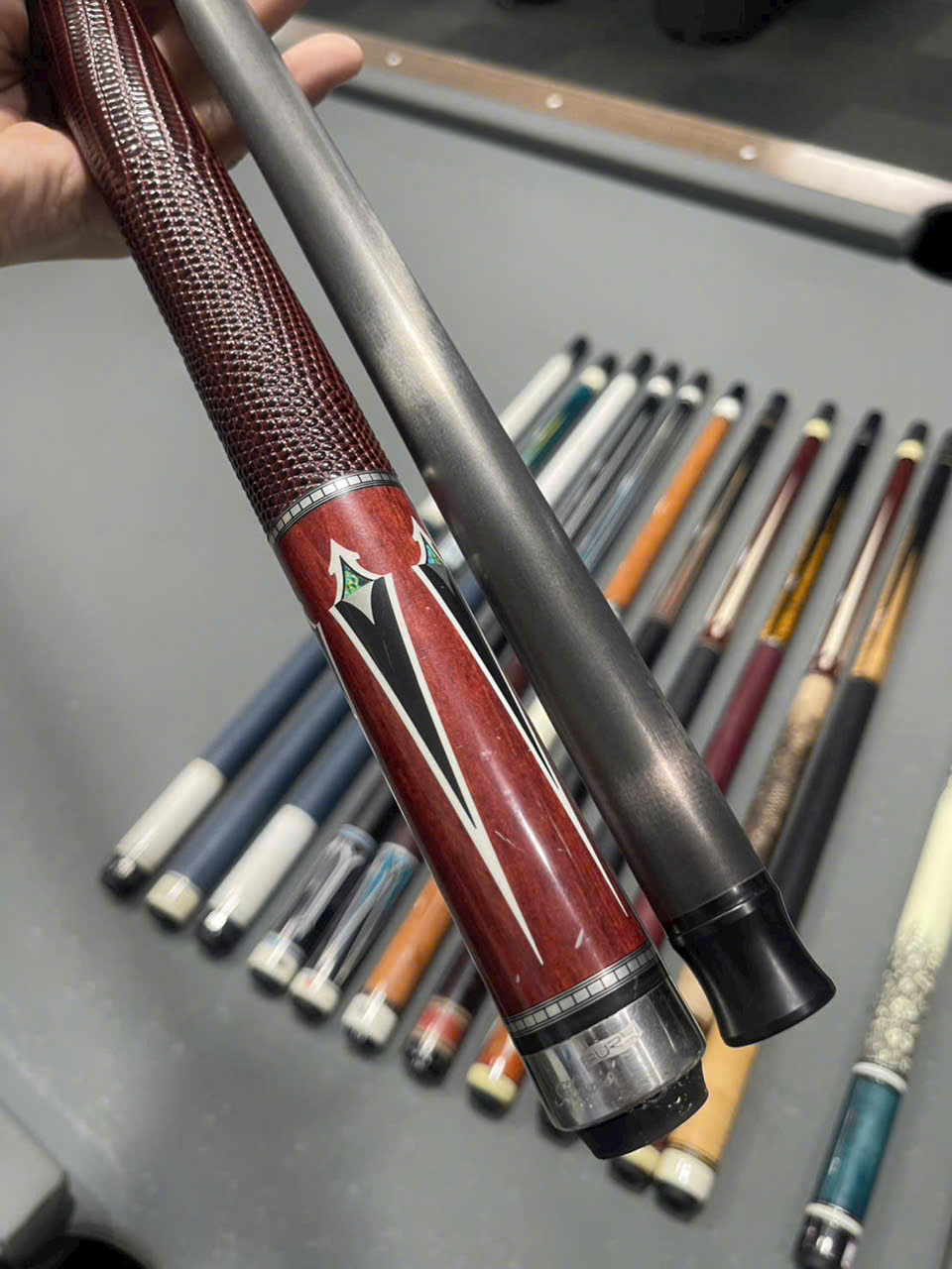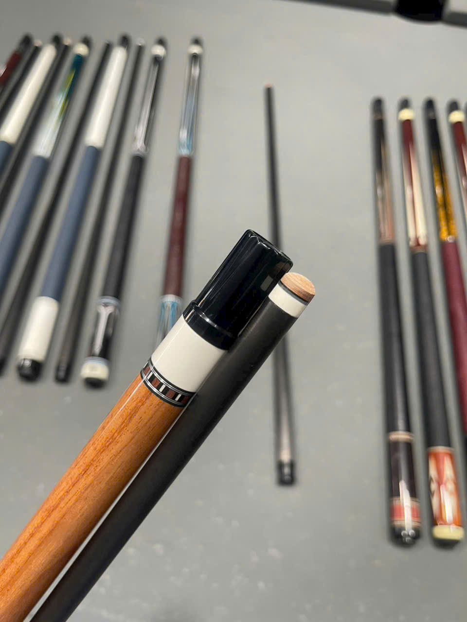 Đầu gậy bi a sau khi dán tẩy hoàn thiện, mài mịn và sẵn sàng cho người chơi.