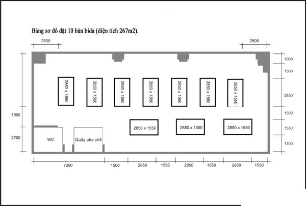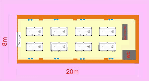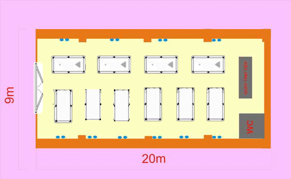 Diện tích mặt bằng thiết kế vị trí sắp đặt bàn bida tương đối lớn. Bạn nên kết hợp các dịch vụ giải trí khác để thuận lợi khi kinh doanh. Có thể là: Bàn bi lắc, Karaoke giải trí....