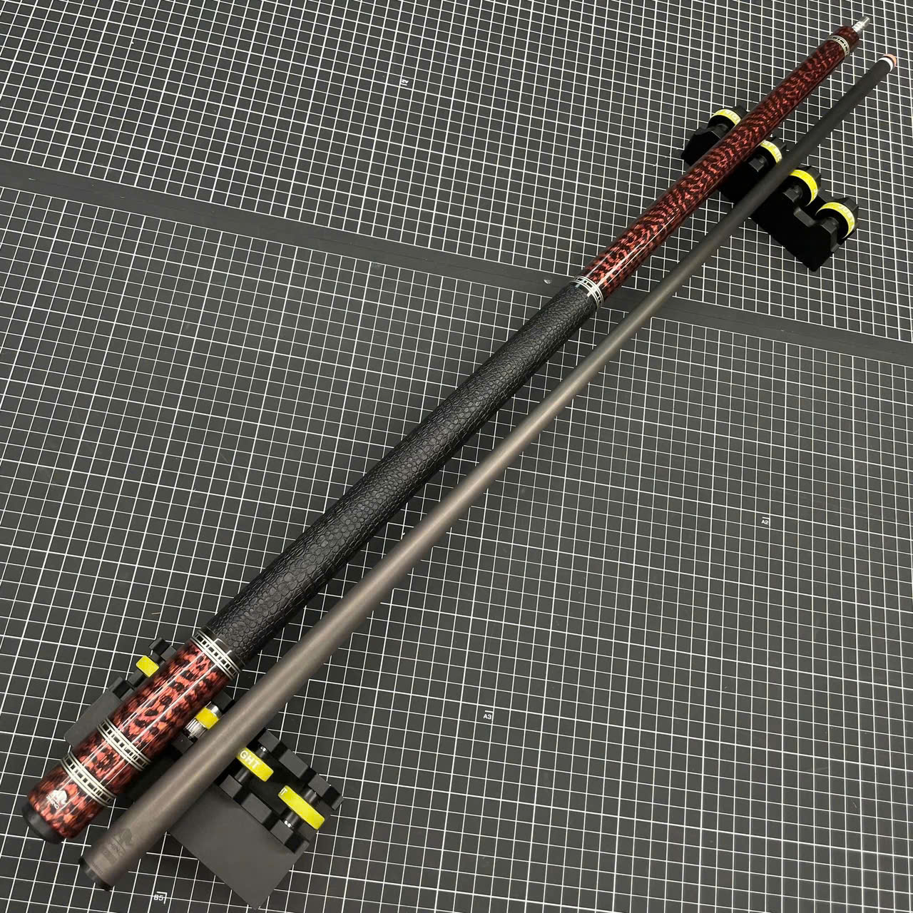 Thợ kỹ thuật kiểm tra gậy bi a sau khi nắn thẳng để đảm bảo chuẩn đường đi của bi.